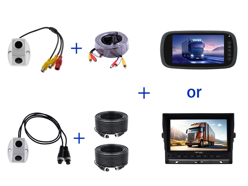 Kit B: If you feel that connecting two extension cables is more suitable, you can choose camera with 4pin aviation connector+2x extension cable +1x rearview monitor, the monitor can be a dash mount monitor or a clip on rearview mirror monitor