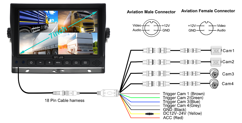 18Pin Cable Harness- Simultaneously connected to 4X1080p cameras, the displayed images are free of interference