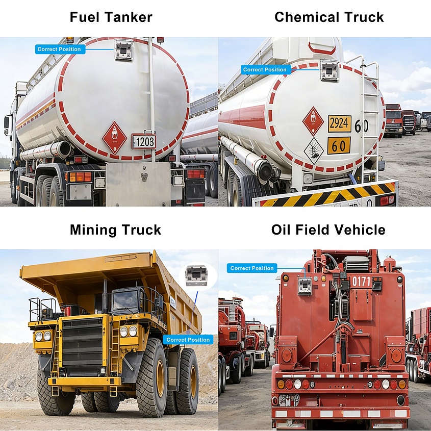Installed on tanker trucks transporting gasoline, diesel, or other flammable liquids to provide rear view and blind spot monitoring.