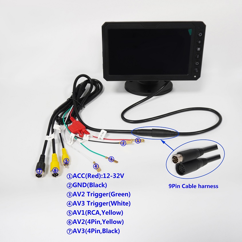 Item number: ST-722RVM, 7-inch 1080P Rearview Monitor with 3 Channel, 3 video input, 2 trigger wires, you can connect rear, side, and front cameras for maximum visibility and safer maneuvering,it perfect for trucks, vans, RVs, buses, trailers, agricultural machinery, forklifts, and industrial vehicles.